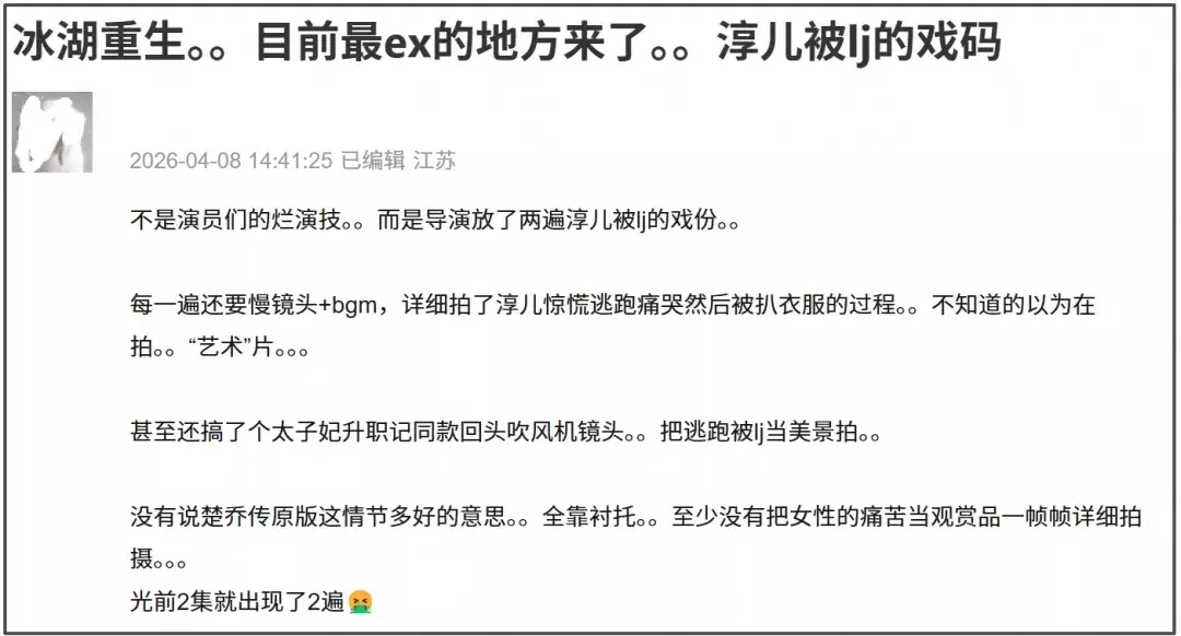 《冰湖更生》这么显着男注视角的画面抒发很快激发烧议,把镜头瞄准受害者,将女性的悲凉当不雅赏品一样一帧一帧详备拍摄,对不异情节的抒发不仅莫得比多年前逾越,以致调谢,让不雅众产生激烈的生理不适之感,这便是对女性的镜头霸凌啊,也难怪该剧一播出就成绩差评无数,这都是它应得的。