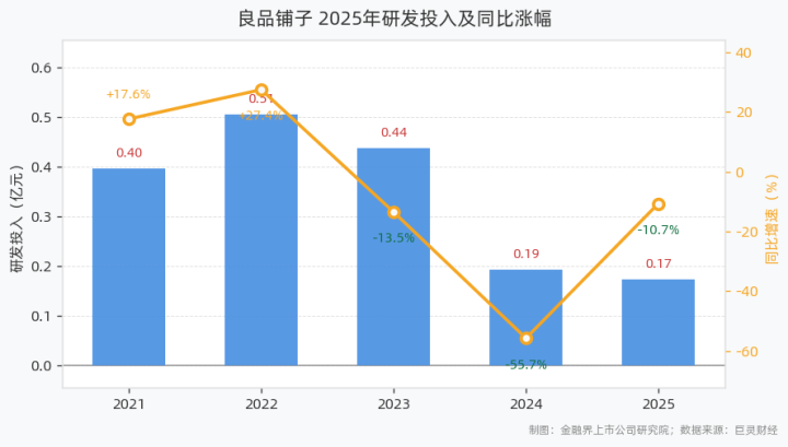 4月21日,良品铺子(603719)清楚2025年年度论述。论述期内,公司全年研发干预达1730.42万元,同比下滑10.67%,占交易收入比例0.32%。当年五年,公司研发干预复合增长率为-15.29%。