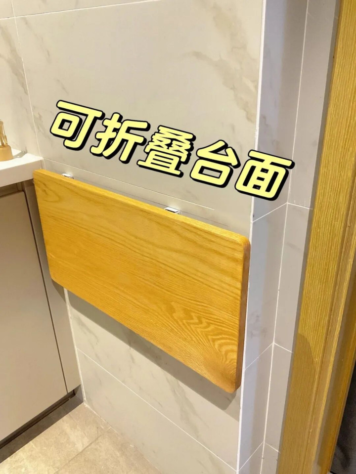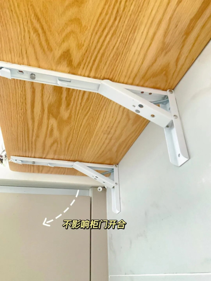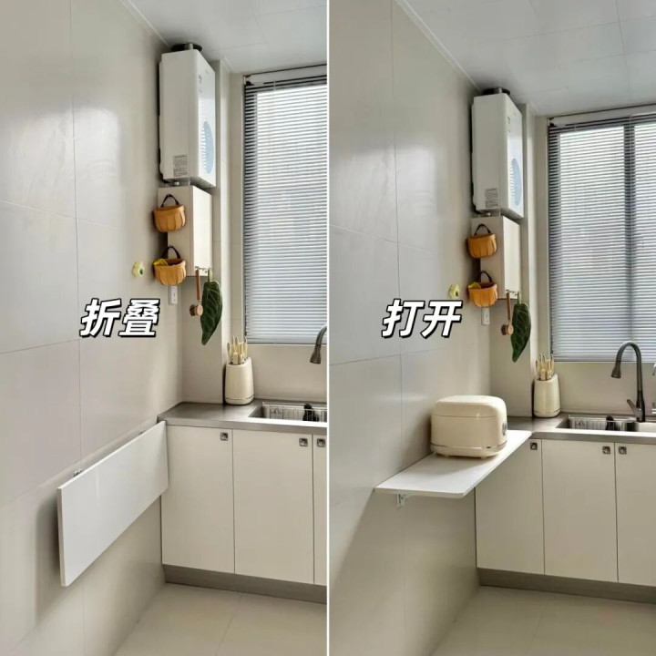 中年大姨在墙上安一块可折叠层板,普通不消的技术,贴在墙上折叠起来,不占场地,不影响步碾儿。