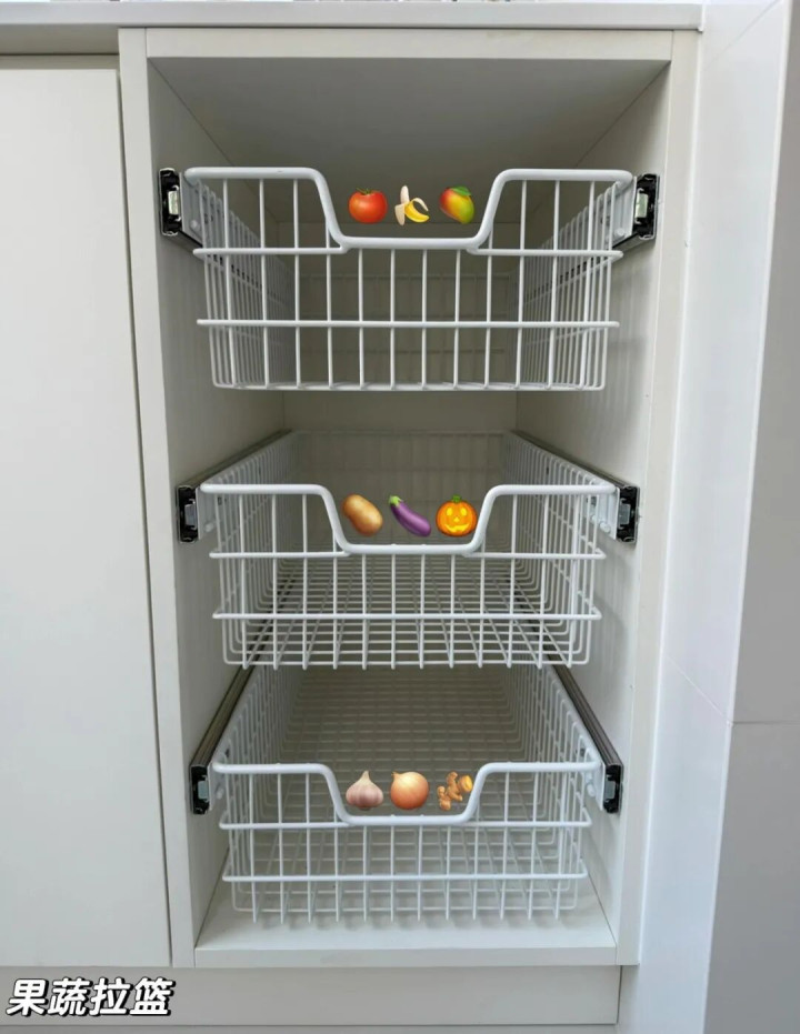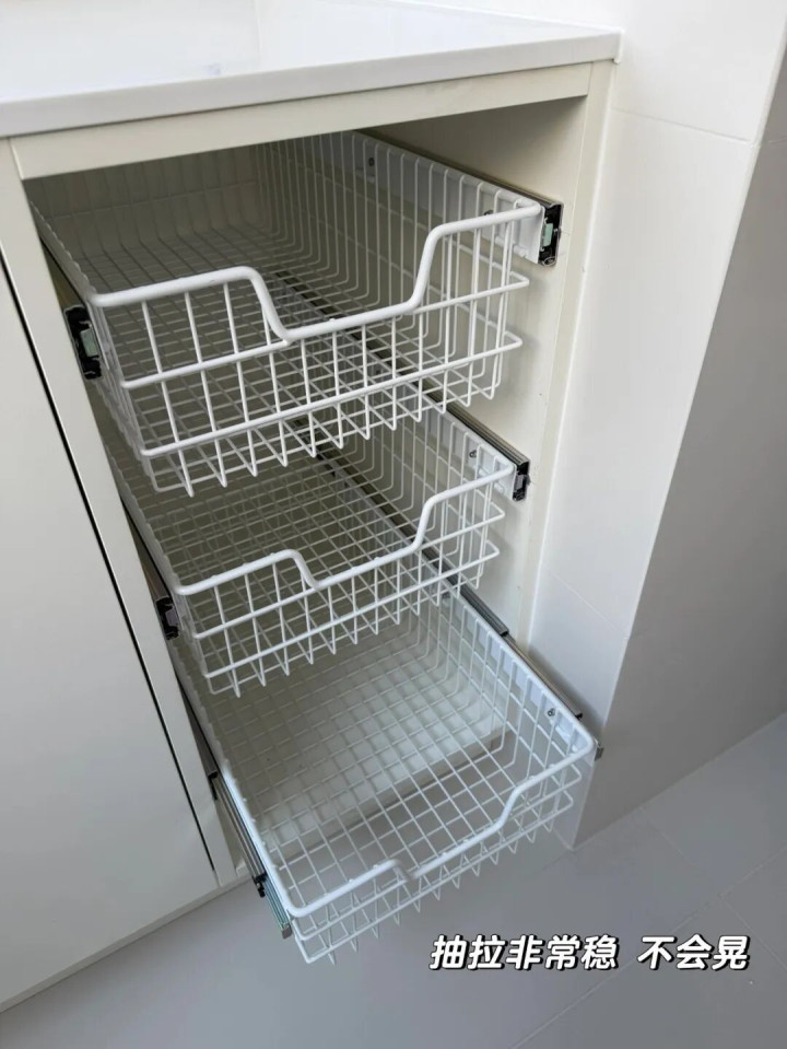 大姨装修厨房的技术,在橱柜里成心空出一格空柜子,不安门,定制三个拉篮装上。