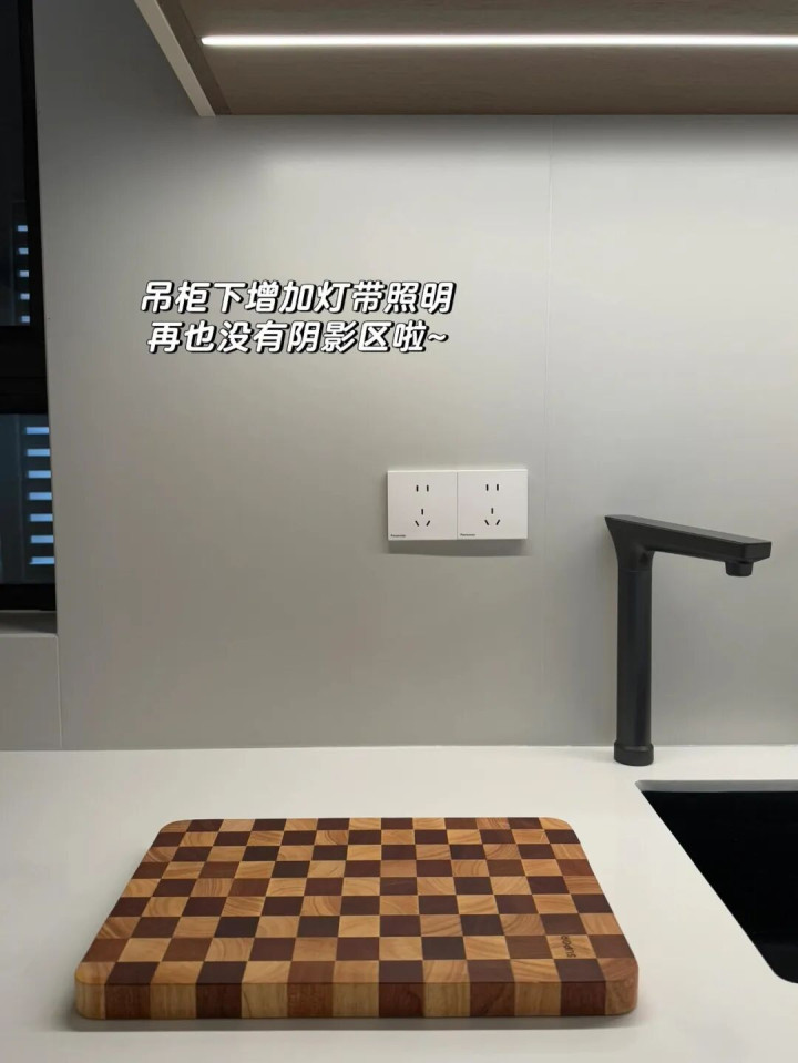 中年大姨在吊柜底下装一条避讳灯带,光泽从前哨映照下来,台面透亮,洗菜、切菜便捷多了。