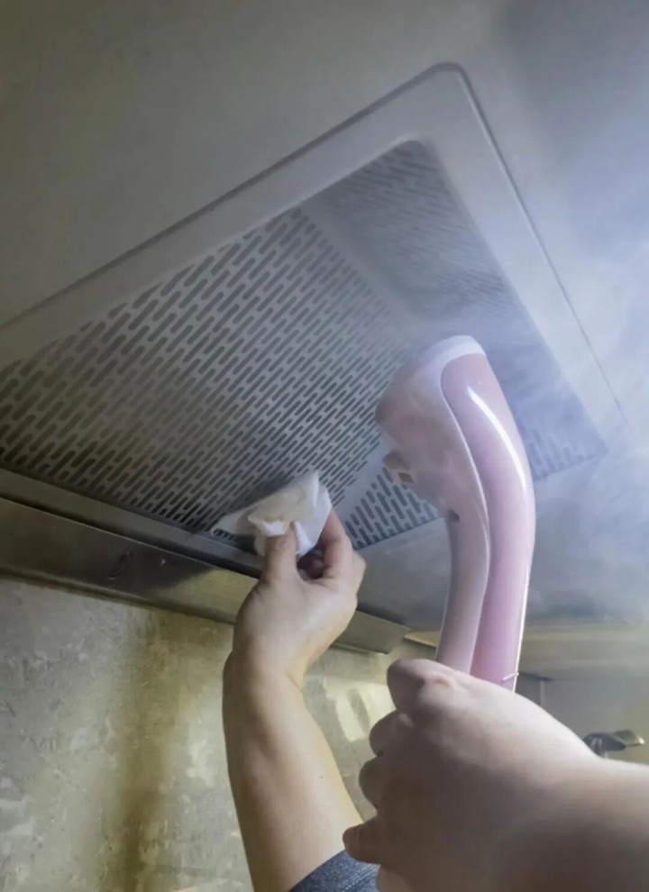 把挂烫机拿出来,在喷头处绑一块干净的抹布,抹布上蘸点洗洁精和小苏打,灵通挂烫机,对着油污处高温蒸汽喷一遍,再毅力的油污也扛不住高温,肉眼可主张溶解,领会,擦一遍就六根清净。