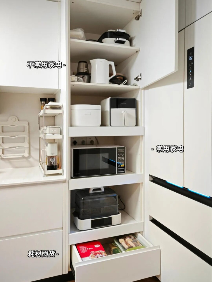 中年大姨装修厨房最不后悔的决定,即是作念一组小家电抽拉高柜,把统共小家电辘集放在一谈。