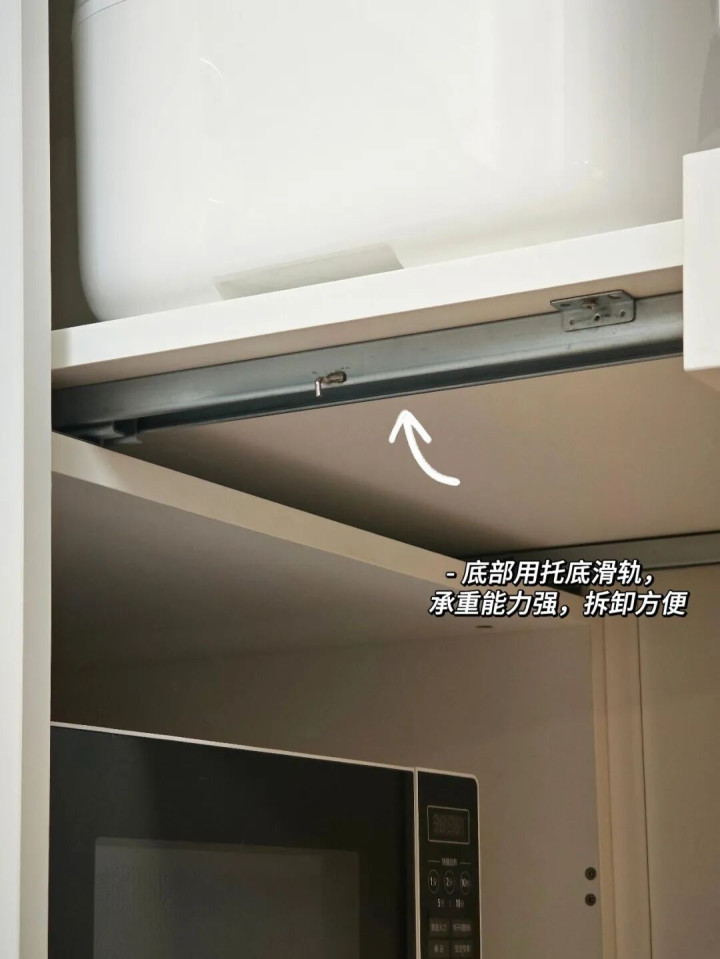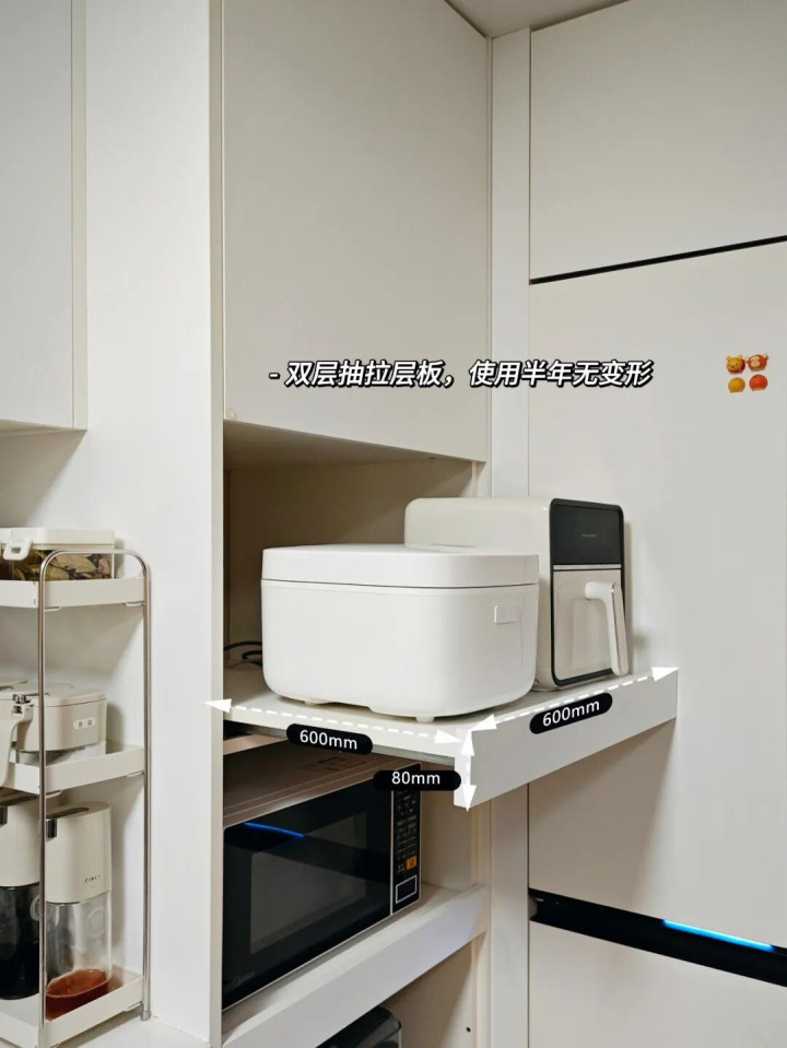 每层抽拉板放一个电器,用哪个小家电,就把哪一层拉出来,比如烧饭的技术,把电饭煲那一层拉出来,蒸汽不会积在柜内,不怕熏坏柜子。