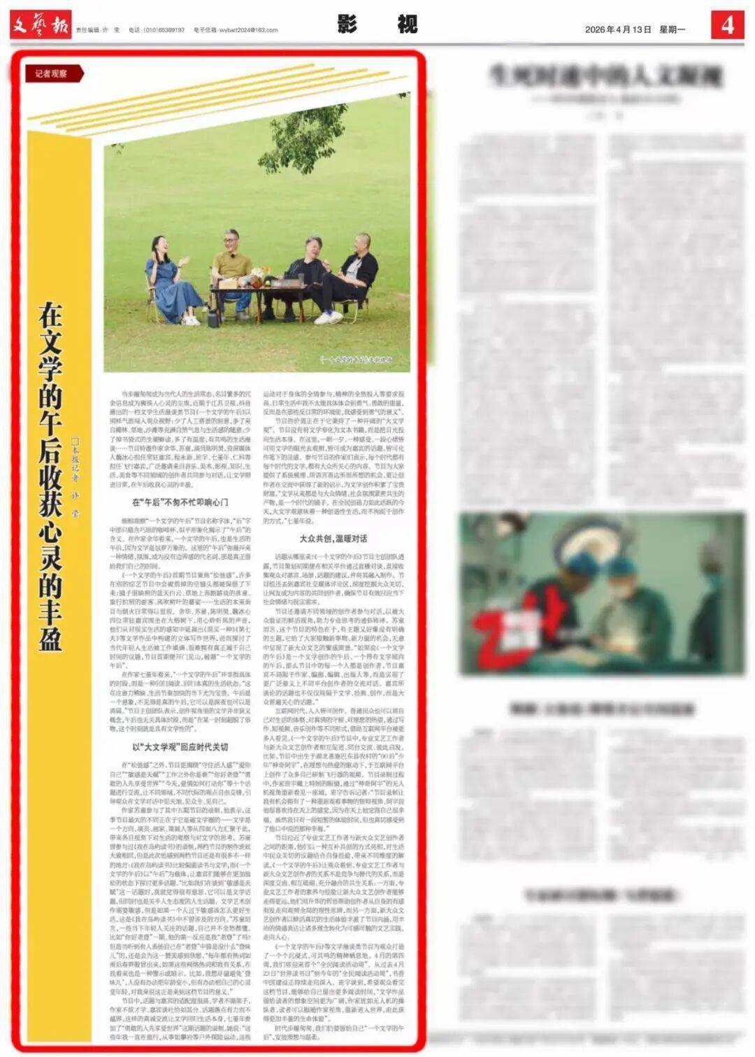 4 月 13 日,《文艺报》发表专题著作《在文体的午后成绩心灵的丰盈》,点赞《一个文体的午后》不仅在体式上冲破了文化节主张固有框架,更在骨子上闭幕了文体对实践生涯的温暖不雅照与精神引颈,为同类节目如缘何微弱姿态承载沉着内涵、以真挚对话引发群众共识,提供了宽裕启发性的新范本。