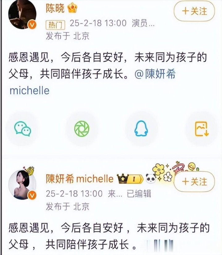 一年前,陈妍希和陈晓在应答平台同步发布离异声明,一句“和瓜分开,共同抚育孩子”,遣散了九年的婚配。