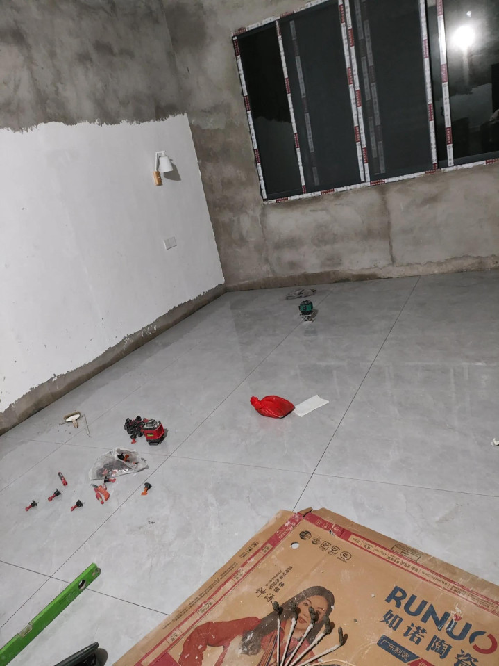 这厢刚装好电灯,电线,那厢就紧锣密饱读的初始铺贴地板砖。